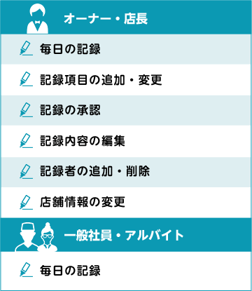 お店全体で取り組めるようスタッフ全員を登録・設定することが可能です。その日の記録者も把握できるため、管理も簡単になります。