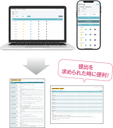 アプリで保存されたデータは、専用WEBページへアクセスし、アプリのID・パスワードでログインすることで印刷も可能に。また、計画書や記録表は、PDF形式で保存できるのでお持ちのスマホやパソコンでデータとして管理できます。