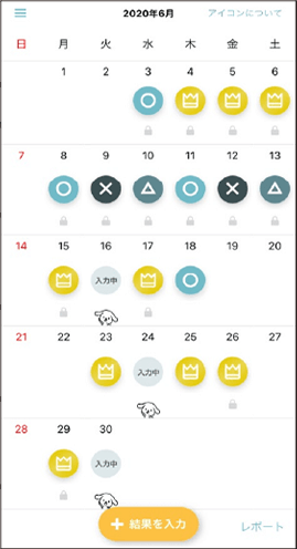 カレンダー画面には、日々の管理結果が表示され、過去の記録を簡単に確認できます。また、アプリに保存された日々の管理データから、毎月の一覧を作成することも可能です。