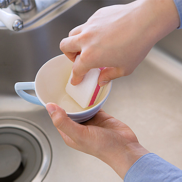 高密度メラミンフォームで、洗剤を使わなくても手アカ、水アカが簡単に落とせます。 白い食器の黄ばみや湯のみについた茶渋も、水に濡らして軽くこするだけでOK。