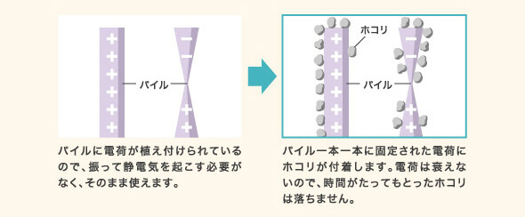 パイルに電荷が植え付けられているので、振って静電気を起こす必要がなく、そのまま使えます。 パイル一本一本に固定された電荷にホコリが付着します。電荷は衰えないので、時間がたってもとったホコリは落ちません。