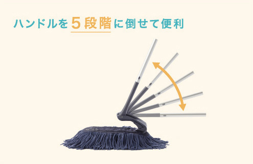 ハンドルは、傾斜角度を20度~90度まで5段階に調整可能。フロアの拭きそうじはちょっとだけ傾斜させて、テーブルやソファの下などの低いところは90度に傾斜させれば、スイスイおそうじできます。