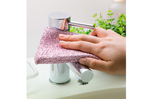 アルミ微粒子の力で、湯アカ・石けんカスを軽くこするだけで落とせます。