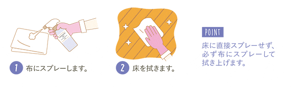 布にスプレーします。床を拭きます。床に直接スプレーせず、必ず布にスプレーして拭き上げます。