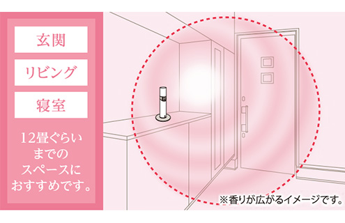 香りの粒子をイオンの力で行き渡らせます。比較的広い範囲にまで香りが広がるので、いろいろな空間でお楽しみいただけます。