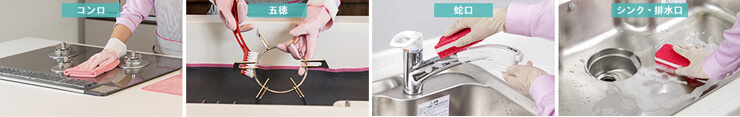 水や油を頻繁に使うキッチンは汚れ方もガンコ。こすってもなかなか落とし切れない油汚れやこげつき、見落としがちな細かい場所も残さず洗浄します。