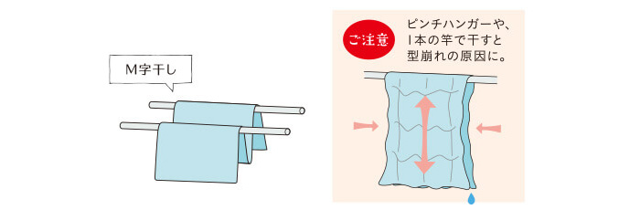 この商品は編み物のため、干す時に水分の重みで垂直方向に伸び、水平方向に縮みやすくなっております。これは編み目の幅が変わることによるもので、糸が伸びきったわけではありません。もし変形した場合は、再度お洗濯していただき、伸びた辺を水平方向(縮んだ辺を垂直方向)にして干していただくと、元の形状に戻ります。
