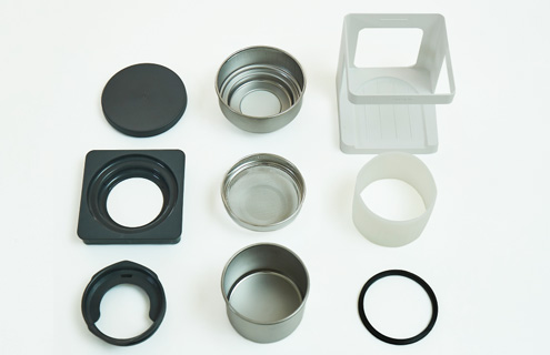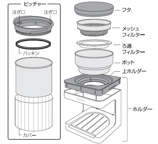材質 SUS 304(ステンレス部)、ポリスチレン樹脂(フタ、注ぎ口)、AES樹脂(ホルダー)、シリコーンゴム(パッキン、カバー)