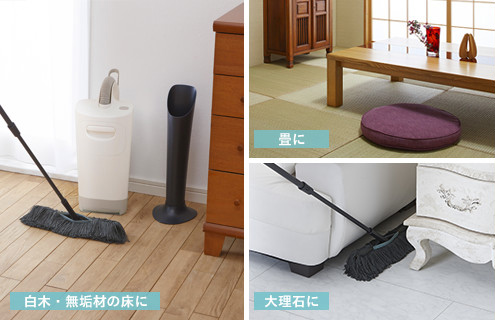 パイルに吸着剤を加工していないので表面加工されていない白木や無垢材、畳、大理石などのデリケートな床材にも安心してお使いいただけます。(※吸着剤モップによる畳への使用は、モップが新しいうちは使用することができます。)