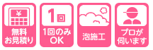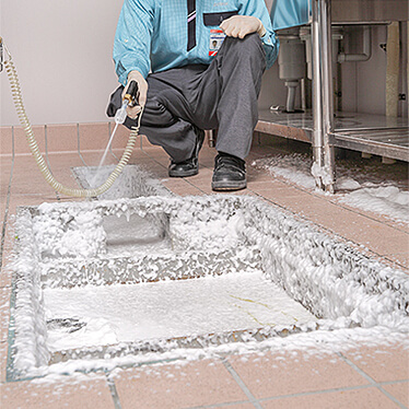 飛散を防止!ダスキンのチョウバエ駆除サービスは「泡施工」。液体の薬剤と異なり、泡で薬剤の飛び散りを防ぎます。