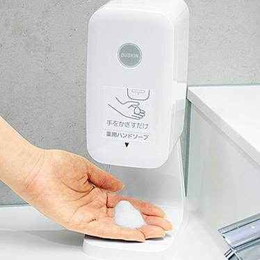 手をさしだすとセンサーが感知、1回分の薬剤を泡状に吐出します。 手を触れないので、感染予防などにも役立ちます。