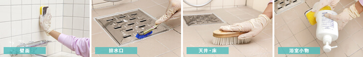 スピーディーかつ確実に洗浄するため、汚れの種類や状態をしっかり確認。浴槽や壁、床など、それぞれの材質に合わせて最適な薬剤と道具を使用します。